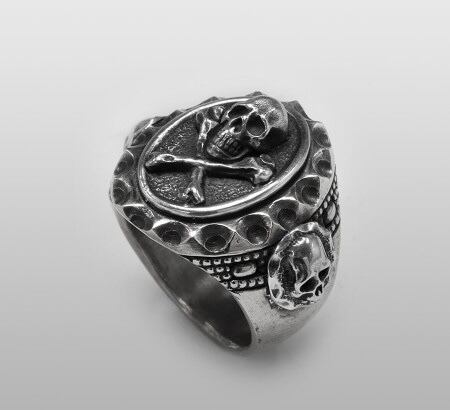 朴訥とした武骨なデザインとサイドから隆起する二対のスカルが指元で強いオーラを放つアイテム。