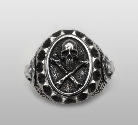 中央に浮かび上がる奇怪なスカルとクロスボーンを囲うように重厚な装飾が施されたシルバーのリング。