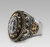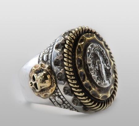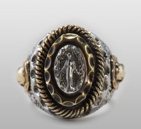 リングの中央から浮かび上がる真鍮のマリア像が指元で崇高な佇まいを見せるリング。