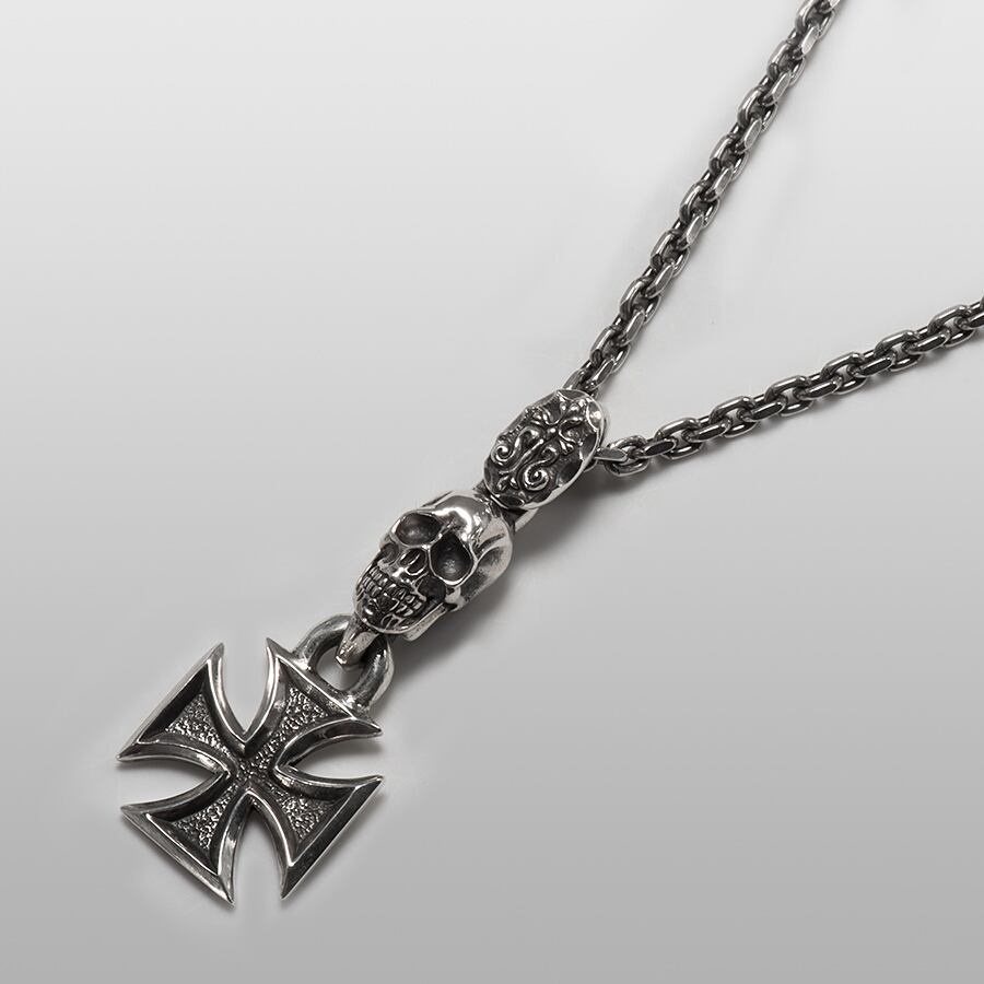 怪異な存在感を放つスカルと美しいクロスが胸元で強いインパクトを放つアイテム。