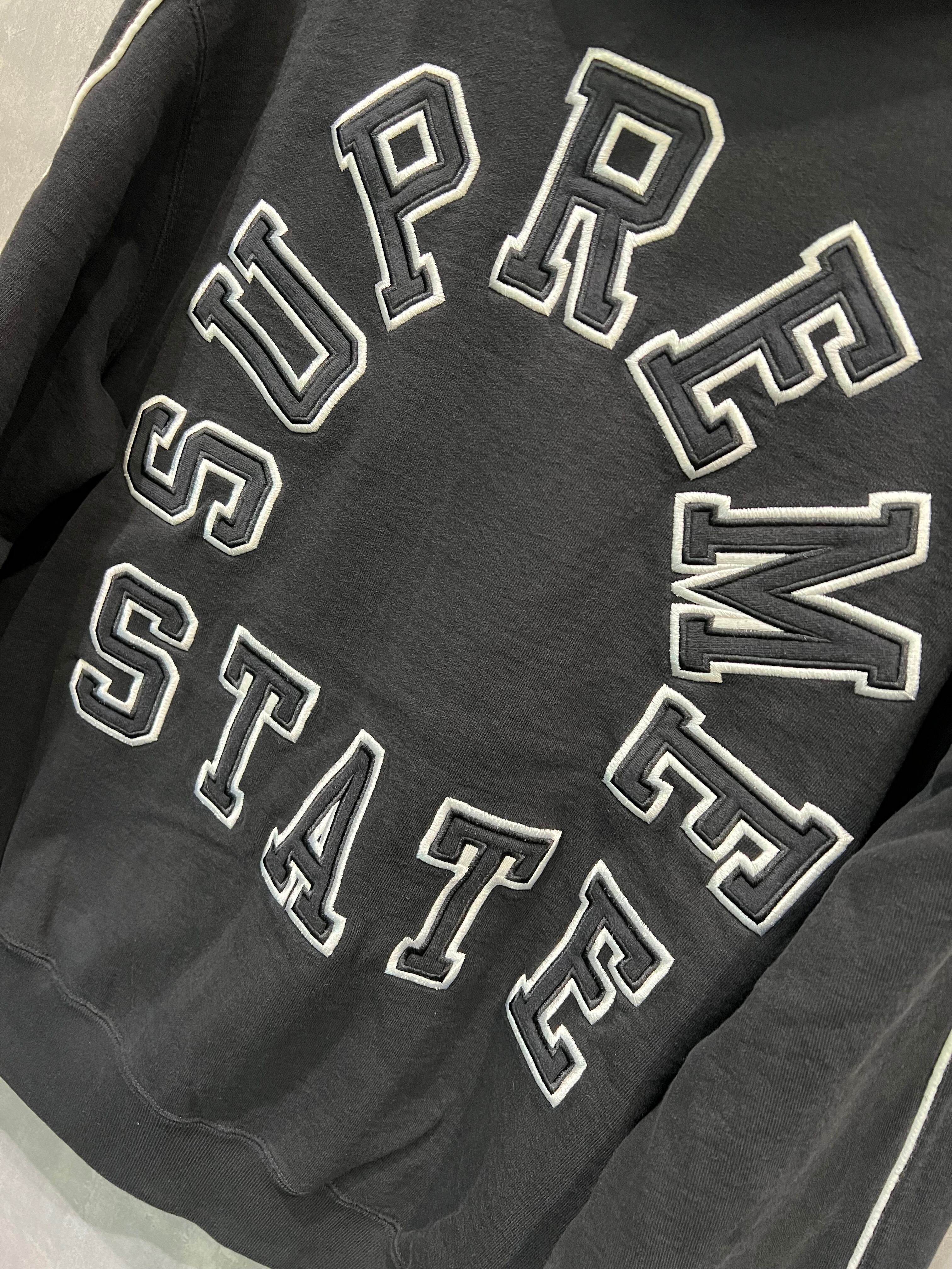 SUPREME STATEのテキストが背中に配置された洗いざらし加工が施されたジップアップフーディー